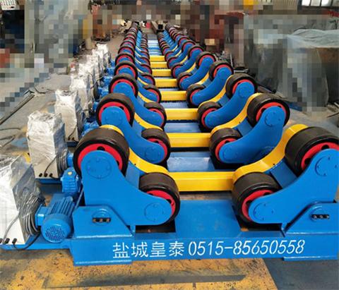 自調(diào)式滾輪架的性能特點(diǎn) 1、自調(diào)式焊接滾輪架主要由主動(dòng)滾輪架、被動(dòng)滾輪架、電控系統(tǒng)等組成。 2、主動(dòng)(被動(dòng))滾輪架底座上分別安裝有兩組能轉(zhuǎn)動(dòng)一定角度的滾輪裝置,兩組滾輪裝置能夠繞其心軸轉(zhuǎn)動(dòng)一定角度,故隨工件規(guī)格大小能自動(dòng)調(diào)整從而保證工件旋轉(zhuǎn)時(shí)平穩(wěn),連續(xù)。 主動(dòng)滾輪架上安裝有一套驅(qū)動(dòng)裝置,驅(qū)動(dòng)裝置主要由驅(qū)動(dòng)電機(jī)、減速器、聯(lián)軸器、聯(lián)接軸等組成。驅(qū)動(dòng)電機(jī)采用國內(nèi)交流電機(jī)驅(qū)動(dòng),通過 級蝸輪蝸桿減速機(jī)驅(qū)動(dòng)與兩組滾輪裝置心軸同軸的蝸輪蝸桿減速機(jī),再通過兩組齒輪傳動(dòng)裝置從而驅(qū)動(dòng)滾輪旋轉(zhuǎn),工件旋轉(zhuǎn)時(shí)能對